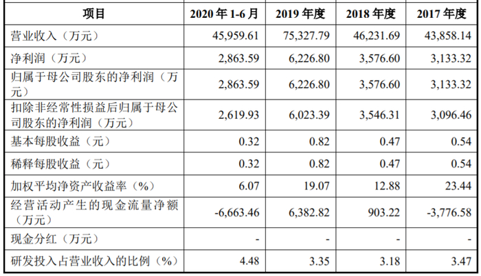 招股书财务数据显示,2017年至2020年上半年,元道通信分别实现营业收入43,858.14万元、46,231.69万元、75,327.79万元、45,959.61万元;实现归属于母公司股东的净利润3,133.32万元、3,576.60万元、6,226.80万元、2,863.59万元。