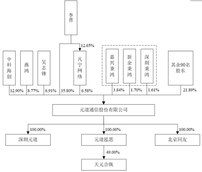 截至本招股说明书签署日,元道通信拥有全资子公司三家、参股公司一家。李晋直接持有公司32,644,130股股份,占公司股本总额的35.80%;通过凡宁网络间接持有公司759,000股股份,占公司股本总额的0.83%,直接和间接合计持有公司33,403,130股股份,占公司股本总额的36.63%。同时,李晋通过凡宁网络控制公司表决权占总表决权比例为6.58%,直接及间接控制公司表决权占总表决权比例为42.38%,为元道通信的控股股东及实际控制人。