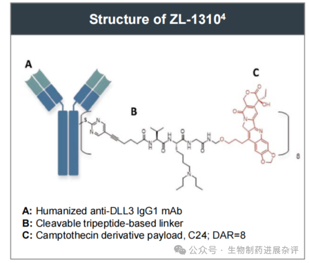 ZL-1310,采用可裂解linker,payload为拓扑异构酶I抑制剂,DAR值为8。