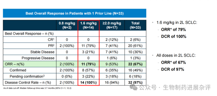 数据来源:根据公开数据整理目前在DLL3靶点和小细胞肺癌领域,几款重要产品均公开了各自已取得的临床数据。由于产品类型不同,甚至靶点不同,因此在临床设计、入组患者基线/剂量等方面也各有差异。