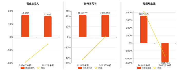 公司营业总收入为11.86亿元,在已披露的同业公司中排名第17,较去年同报告期营业总收入减少7089.93万元,同比较去年同期下降5.64%。归母净利润为2250.45万元,在已披露的同业公司中排名第11。经营活动现金净流入为-4455.49万元,在已披露的同业公司中排名第14,较去年同报告期经营活动现金净流入减少1.07亿元,同比较去年同期下降170.86%。