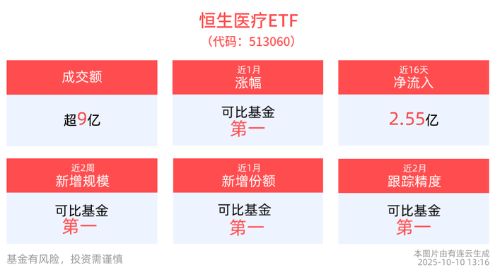 流动性方面,恒生医疗ETF盘中换手12.99%,成交9.53亿元,市场交投活跃。拉长时间看,截至10月9日,恒生医疗ETF近1月日均成交17.61亿元,居可比基金第一。