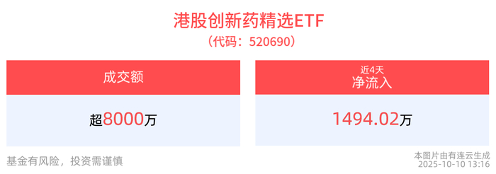 流动性方面,港股创新药精选ETF盘中换手19.53%,成交8451.34万元,市场交投活跃。拉长时间看,截至10月9日,港股创新药精选ETF近1月日均成交1.33亿元。