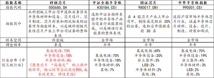 市场上芯片相关指数众多,选取当下热门的科创芯片、半导体等指数进行比较,可以发现,虽然均聚焦为芯片板块,但在指数编制上却大有不同。一句话总结:科创芯片指数聚焦芯片核心环节,“含芯量”更高,弹性强,成长性高。
