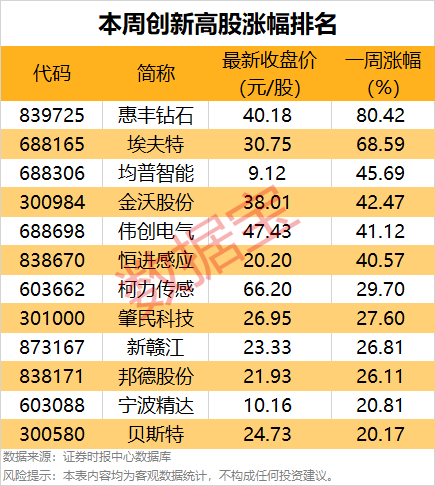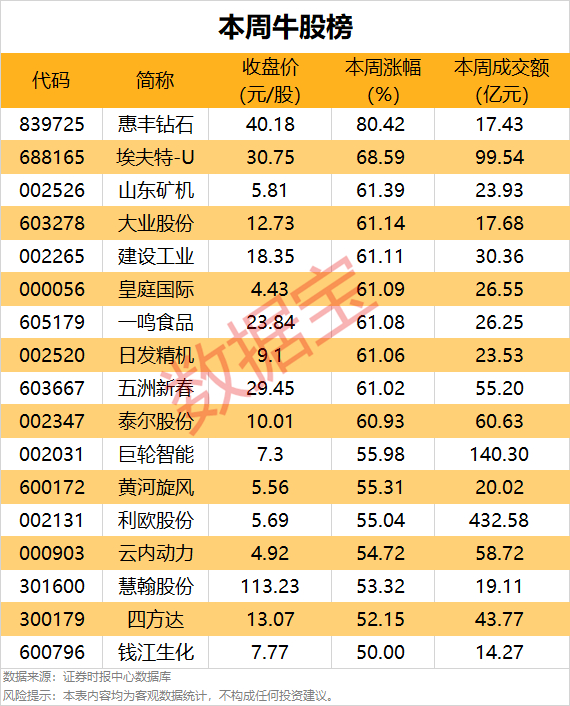 涨幅最大的是北交所的惠丰钻石,公司是国内领先的金刚石微粉产品供应商,参与“超硬磨料人造金刚石微粉”国家标准的起草。近期,金刚石等超硬材料出口被列入管制,培育钻石概念持续走强,公司股价一周内有两个交易日“30cm”涨停,一周累计涨幅80.42%。