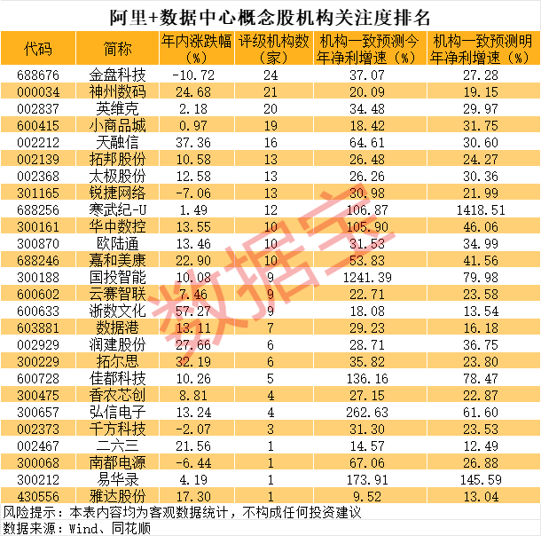 在业内人士看来,与阿里云相关的概念股更能实质性受益于人工智能时代。证券时报·数据宝统计出,同时有阿里概念和数据中心概念的合计26只股票有机构评级。从成长性来看,寒武纪-U、国投智能、佳都科技、易华录、弘信电子等个股机构一致预测今明两年净利增速均超30%。