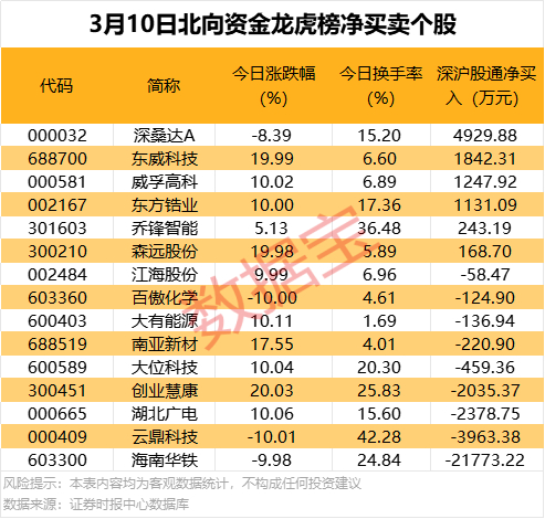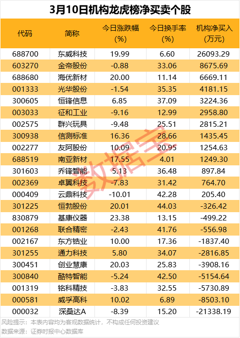 3月10日龙虎榜中,共13股获机构净买入,东威科技获机构净买入额为2.61亿元,净买入居首;金帝股份、海优新材机构净买入额均超5000万元。机构净卖出金额居前的有深桑达A、威孚高科、铭科精技等。
