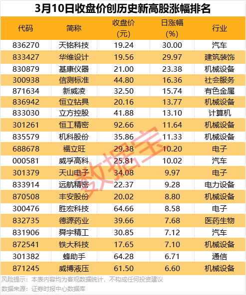 收盘价创历史新高股中,今日股价平均上涨7.28%,涨停的有天铭科技、华维设计、威孚高科等,涨幅居前的有基康仪器、信测标准、新威凌等。