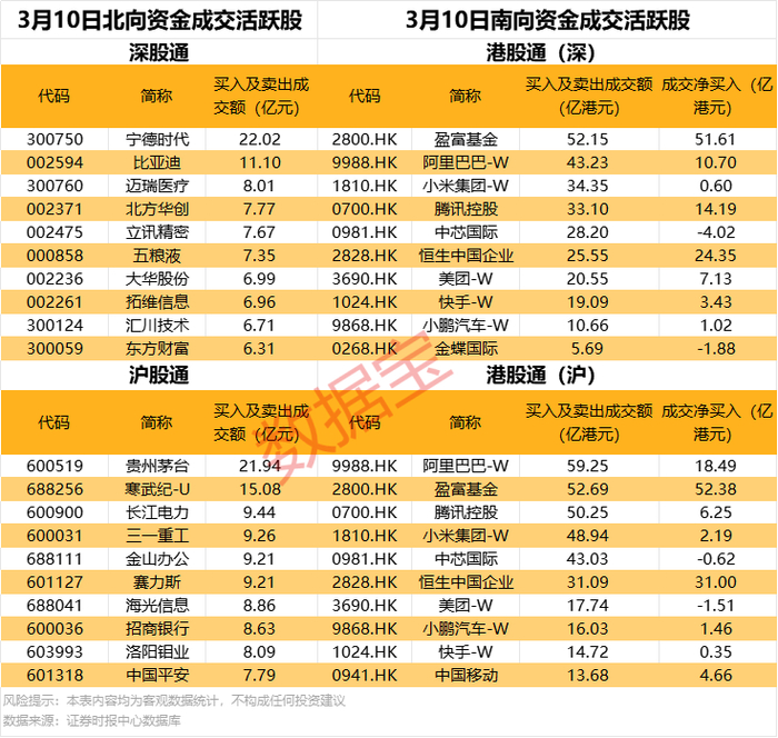 3月10日北向资金成交额为1896.15亿元,成交活跃股中,宁德时代、贵州茅台等北向资金成交额居前。