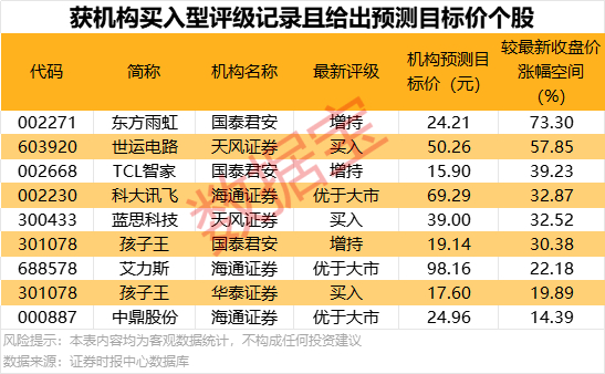 获机构买入型评级个股中,共有9条评级记录中对相关个股给出了未来目标价。以公布的预测目标价与最新收盘价进行对比显示,共有7股上涨空间超20%。东方雨虹上涨空间最高,3月10日国泰君安预计公司目标价为24.21元,上涨空间达73.30%;上涨空间较高的个股还有世运电路、TCL智家等,上涨空间分别为57.85%、39.23%。
