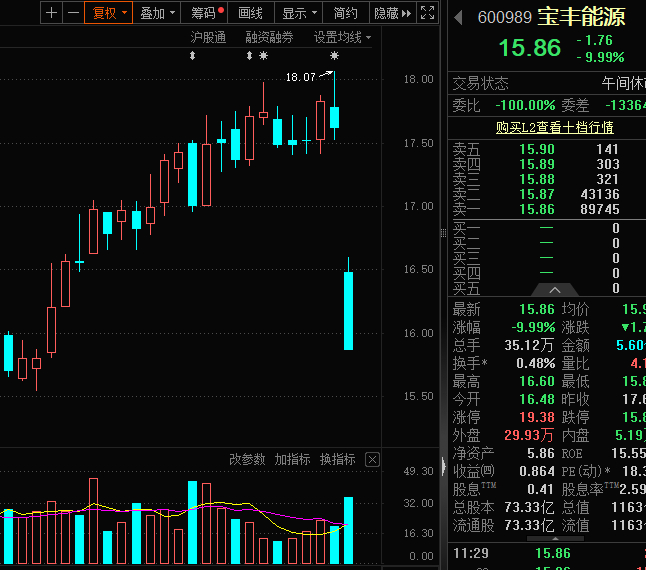 早盘,宝丰能源大幅低开逾6%,开盘后不到1分钟即封死跌停,截至上午收盘,该股报15.86元/股,跌停封单近9万手,最新市值1163亿元。