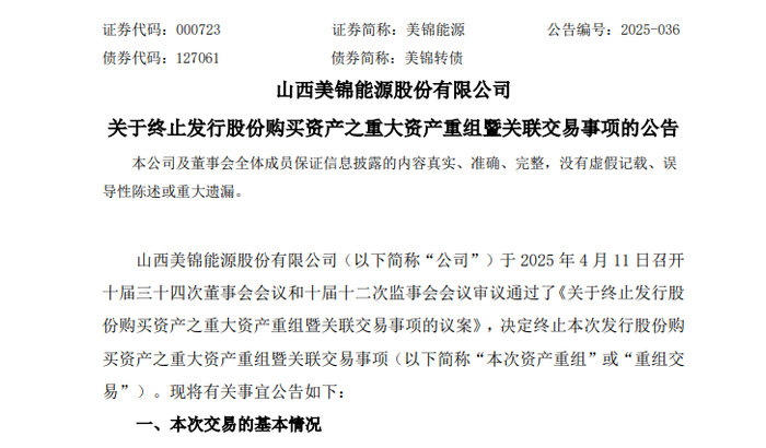 美锦能源(000723)筹划的重大资产重组事项,突然宣告终止。