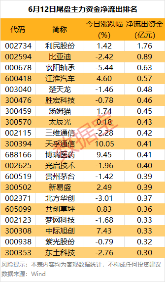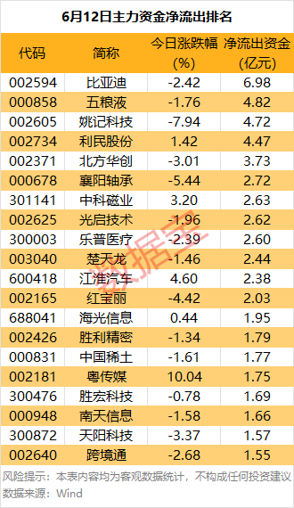 比亚迪主力资金净流出金额居首,达6.98亿元。此外,还有五粮液、姚记科技和利民股份等个股主力资金净流出居前。