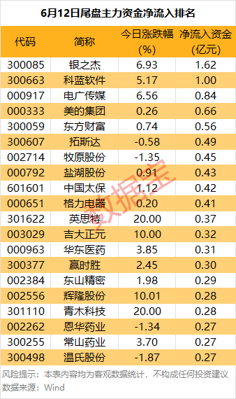 从个股来看,10股尾盘主力资金净流入均超4000万元。银之杰尾盘主力资金净流入居首,达1.62亿元。