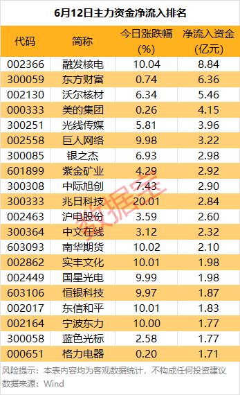 融发核电主力资金净流入8.84亿元,居首,收盘涨停。消息面上,公司公告称,拟面向专业投资者非公开发行不超过10亿元公司债券,债券品种包括科创债和中小微企业支持债券,相关议案将于6月27日临时股东大会审议。