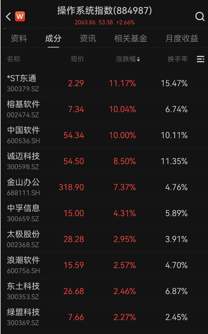 早盘国产软件概念活跃,工业软件、信创方向领涨,金山办公涨7.37%,榕基软件、中国软件、盈建科等涨停,诚迈科技、中望软件、达梦数据、麒麟信安等涨幅居前。
