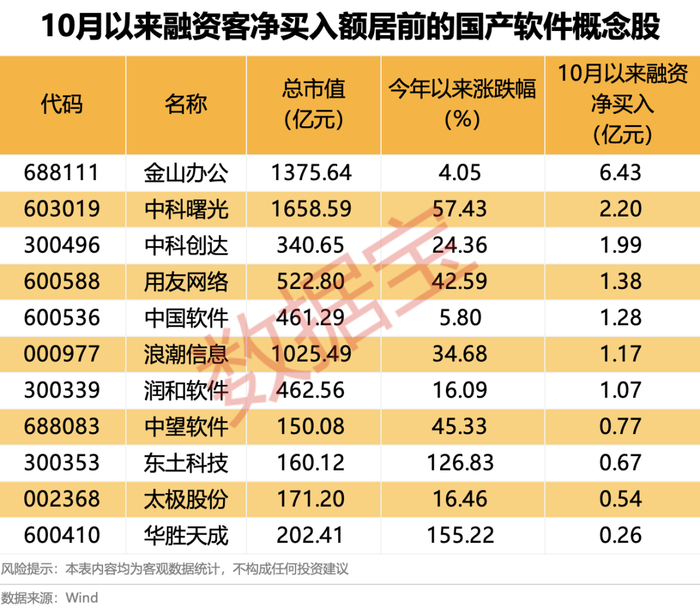从资金面来看,10月以来,超七成概念股获得融资客加仓,其中金山办公、中科曙光、中科创达、用友网络等7股的融资净买入额均超亿元。