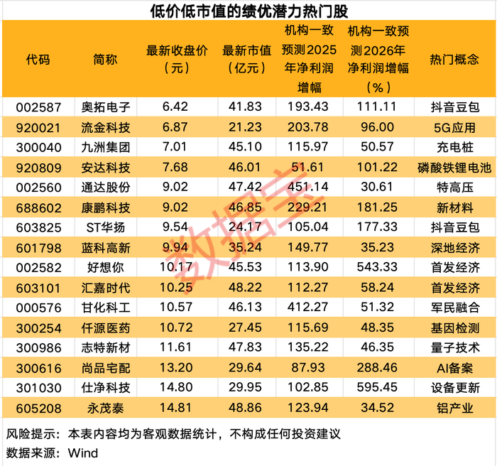 岁末已至,哪些个股具备跨年强势股潜力?笔者从3个维度梳理出16只潜力股:1.截至11月7日,股价在5元/股至15元/股区间,且市值低于50亿元;2.机构一致预测2025年、2026年净利润增幅均超过30%;3.公司涉及量子技术、AI、锂电池等热门概念。