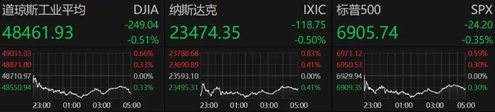 美股三大指数均小幅收跌,道指跌0.51%,纳指跌0.5%,标普500指数跌0.35%。