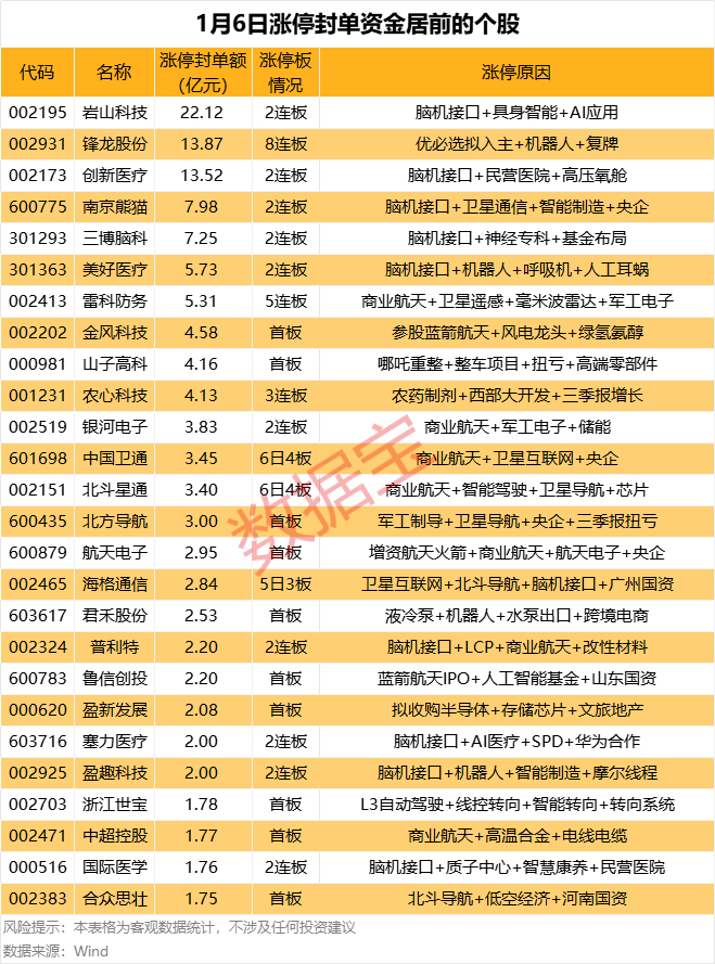 以封单金额计算,岩山科技、锋龙股份、创新医疗等涨停板封单资金最多,分别有22.12亿元、13.87亿元、13.52亿元,其中岩山科技、创新医疗均为脑机接口热门股。从封单力度(封单量占流通A股比例)来看,农心科技、锋龙股份、创新医疗等力度较大,分别为27.43%、17.97%、12.47%。