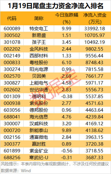 个股方面,特变电工、新易盛、孩子王尾盘主力资金大幅净流入均超1亿元。