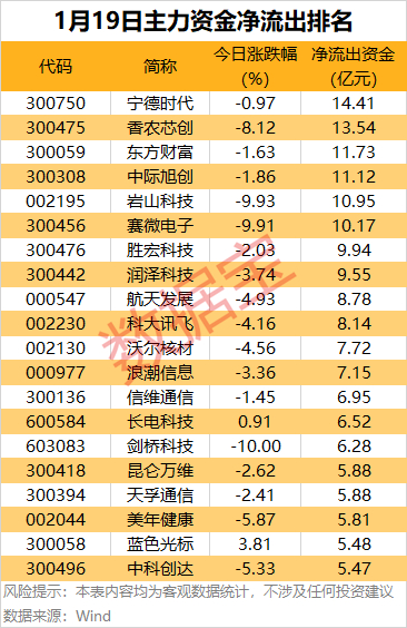 据数据宝统计,今日有74股主力资金净流出均超2亿元,其中宁德时代、香农芯创、东方财富、中际旭创、岩山科技、赛微电子净流出金额均超10亿元。