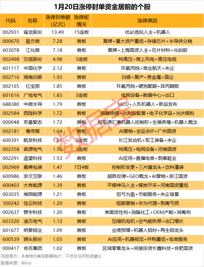 以封单金额计算,锋龙股份、盈方微、江化微涨停板封单资金居前,分别有13.49亿元、7.28亿元、7.18亿元。