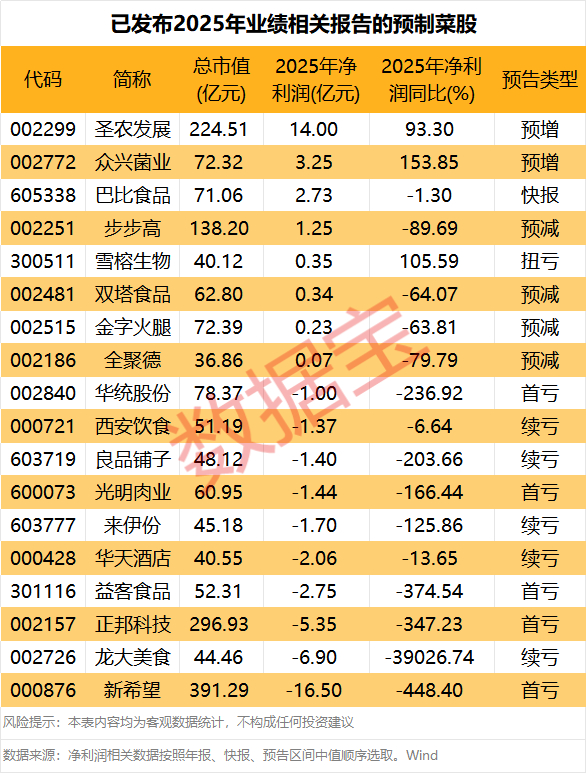 据证券时报·数据宝统计,截至2月6日,已有18只预制菜概念股发布2025年业绩报告。以快报数据或预告中值统计,圣农发展、众兴菌业、巴比食品、步步高净利润规模在1亿元以上,依次为14亿元、3.25亿元、2.73亿元、1.25亿元。