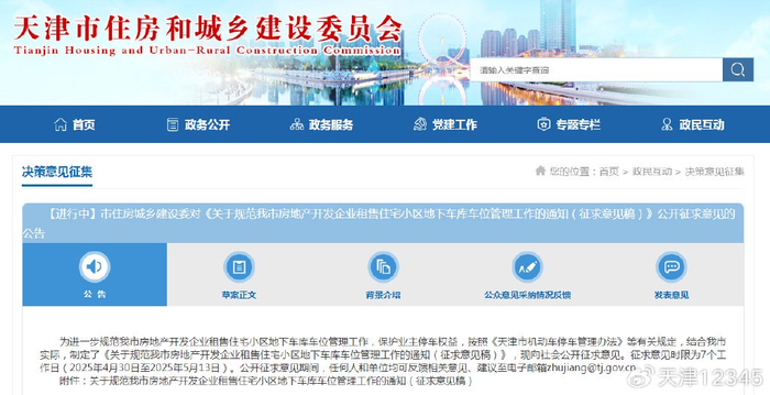 为进一步规范我市房地产开发企业租售住宅小区地下车库车位管理工作,盘活地下车库车位停车资源,保护业主停车权益,市住建委起草《关于规范我市房地产开发企业租售住宅小区地下车库车位管理工作的通知》并公开征求意见。征求意见时限为7个工作日(2025年4月30日至2025年5月13日)。征求意见稿提出——
