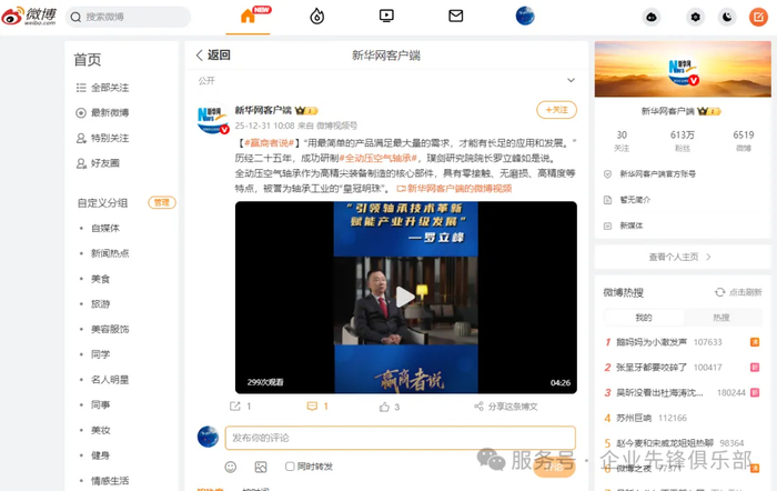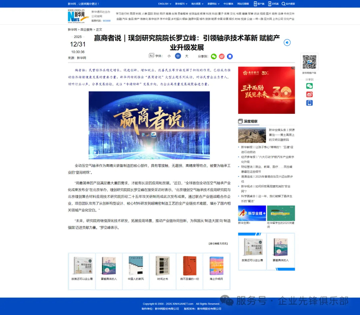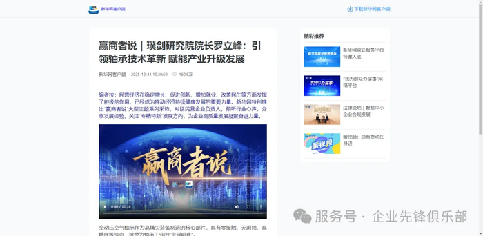 2025年12月31日,由我司运营出品的新华网政企访谈关于璞剑研究院罗立峰院长的专访视频,在新华网主站、新华网客户端、新华网官方视频号、新华网官方抖音号以及新华网官方新浪微博平台同步发布。发布传播数据显著,行业反响巨大,璞剑研究院及罗立峰院长作为行业代表的引领力与辐射力得到大幅增强。