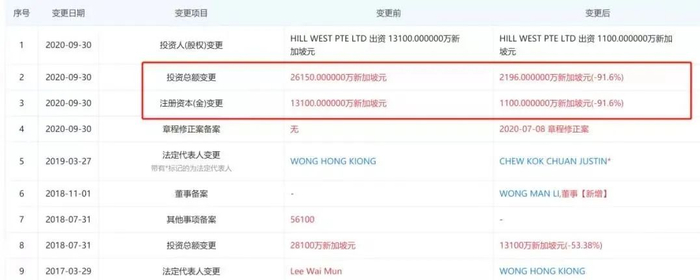 其中以吉宝最为典型。去年9月30日,吉宝成都子公司成都希瑞房地产开发有限公司(以下简称成都希瑞)注册资本从原来的13100万新加坡元减少至1100万新加坡元,投资总额也从2.615亿新加坡元减少至2196万新加坡元,锐减幅度约91.6%。