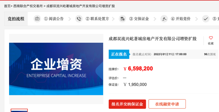 交易截图增资扩股公告显示,双流兴屹拟新增注册资本466.67万元,挂牌交易价格为659.82万元,增资完成之后,新股东控股70%。
