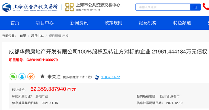 11月15日,成都百利丰投资有限公司转让成都华鼎房地产开发有限100%股权及转让方对标的企业近 2.2亿元债权项目,在上海联合产权交易所上线,交易打包价约6.24亿元。