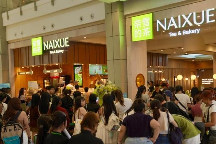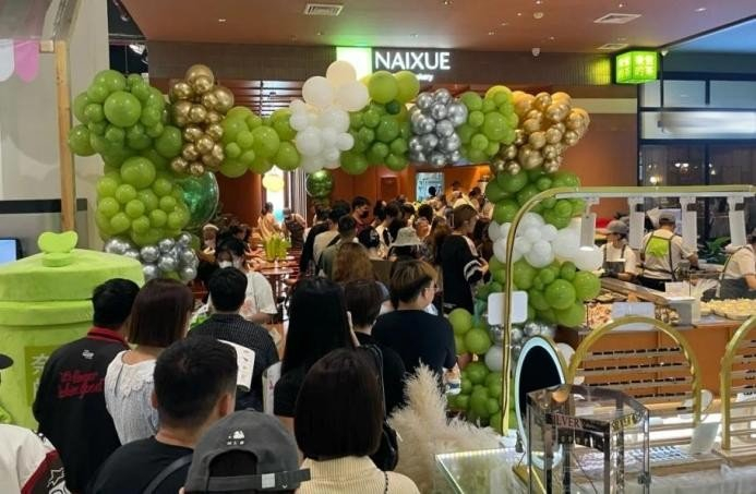 自2023年底起,奈雪强势布局东南亚:首站进驻曼谷Emsphere商场首层,凭借高品质茶饮迅速打开市场,被泰国消费者誉为“超好喝的中国茶”;2024年8月,于曼谷Central World奢侈品区开出全球旗舰店,开业三日营业额近100万泰铢,创海外销售新高。同步落地的还有新加坡樟宜机场星耀综合体、吉隆坡The Exchange TRX、曼谷ONE BANGKOK等核心商圈门店,所到之处皆成现象级消费事件——社交媒体话题量短时激增数千条,排队盛况频登当地新闻。依托顶级商圈的强曝光与“茶饮+烘焙+第三空间”体验,奈雪成为中国高端茶饮品牌代表。
