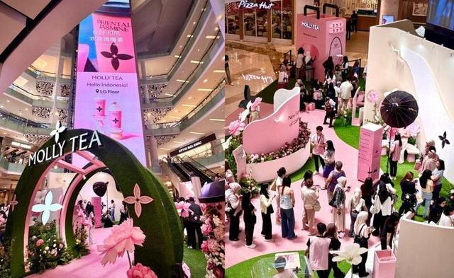 与此同时,还有品牌系统性地运用这套色彩语言。代表如茉莉奶白,将多巴胺色系大面积用于门店和包装,营造出统一的浪漫、快乐、摩登的氛围。其今年在印尼新店开业期间打造的“Molly Tea Garden”快闪花园,便以粉色为主色调,打造出一个梦幻的“东方摩登花园”,吸引当地人排队打卡拍照。