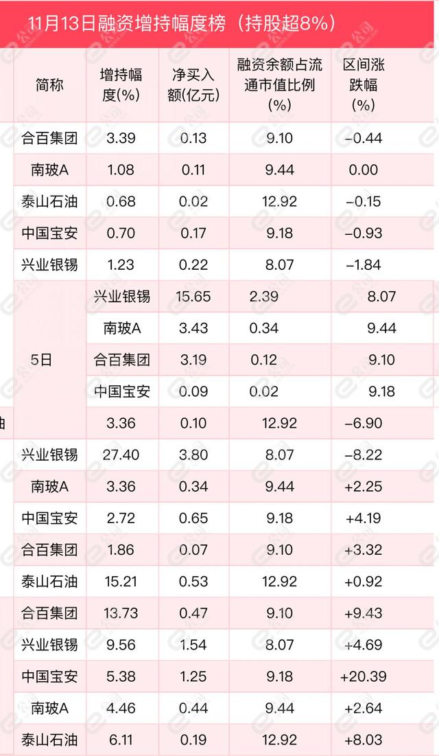 从增减持幅度来看,融资余额占流通股比例超8%的个股中,合百集团、南玻A、泰山石油获融资增持幅度居前,分别为3.39%、1.08%、0.68%。