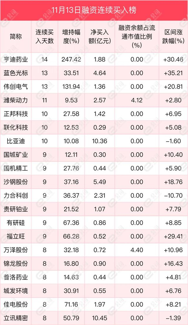 从连续买卖来看,亨迪药业、蓝色光标、伟创电气获融资连续净买入天数居前,分别为14天、13天、13天,期间净买入额分别为1.88亿元、4.64亿元、1.36亿元,期间增持幅度分别为247.42%、33.51%、131.94%。