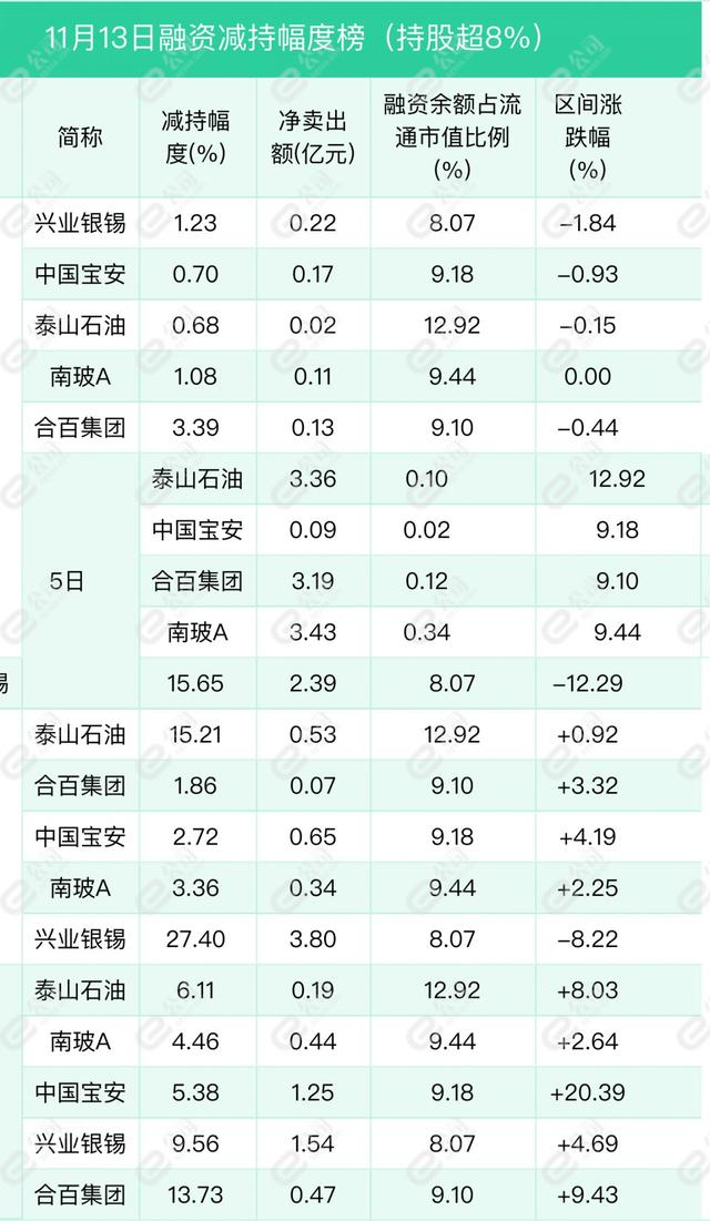兴业银锡、中国宝安、泰山石油遭融资减持幅度居前,分别为1.23%、0.7%、0.68%。