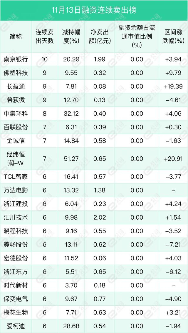 南京银行、佛塑科技、长盈通遭融资连续净卖出天数居前,分别为10天、9天、9天,期间净卖出额分别为1.99亿元、0.32亿元、0.08亿元,期间减持幅度分别为20.29%、9.55%、7.81%。