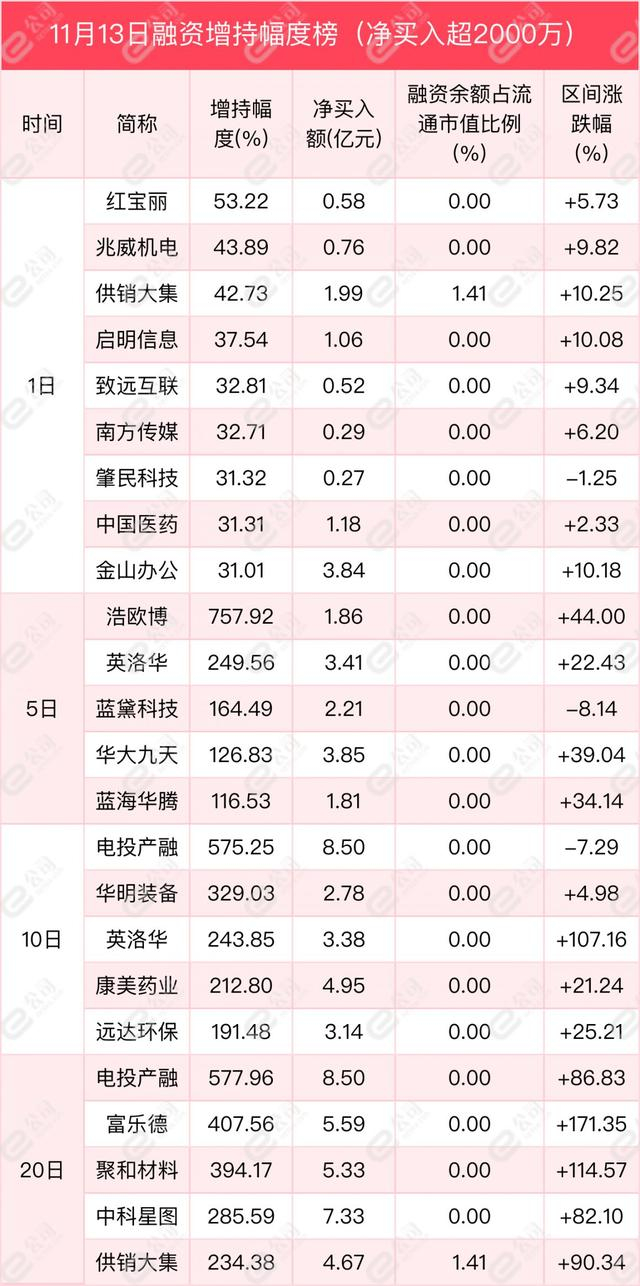 从增减持幅度来看,单日净买卖超2000万元以上的个股中,红宝丽、兆威机电、供销大集获融资增持幅度居前,分别为53.22%、43.89%、42.73%。