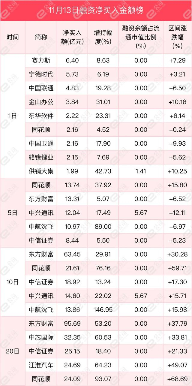 e公司数据统计显示,截至11月13日,融资持仓市值前五行业为电子、非银金融、计算机、医药生物、汽车,占持仓总市值52.24%。