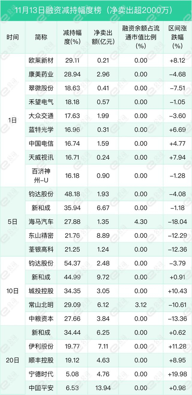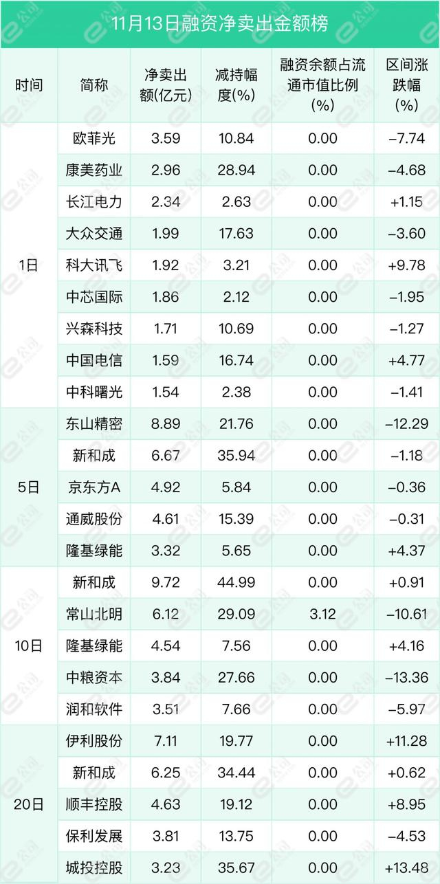 欧菲光、康美药业、长江电力遭融资净卖出金额居前,分别为3.59亿元、2.96亿元、2.34亿元,减持幅度分别为10.84%、28.94%、2.63%。