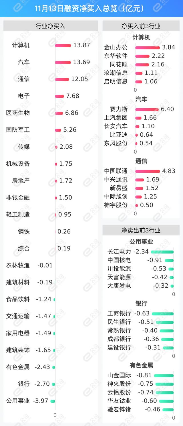 计算机、汽车、通信获融资净买入金额居前,分别为13.87亿元、13.69亿元、12.05亿元。