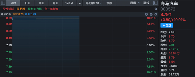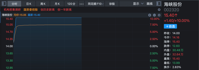 海南板块近来连续走强,今日再度放量大涨逾6%,创7年多来新高。海马汽车秒速涨停,连续第4日封板,股价创10年新高(复权,下同),海峡股份则仅用约4分钟的时间垂直涨停,创历史新高,洲际油气同样直线涨停,3日2板。