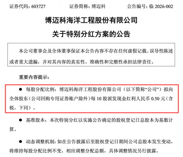 对于推出特别分红方案,博迈科表示系基于公司实际经营情况、资金状况及未来发展规划综合制定,预计不会对公司正常经营和长期发展构成重大影响。
