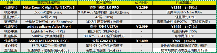 价格高原的崩塌始于一场“技术起义”。当安踏C202 GT 5将氮科技中底和立体碳柱塞进799元的鞋身,当361°飞飚Future用499元实现88%能量回馈率(超越耐克ZoomX 80%),国际品牌引以为傲的“科技溢价”被撕开裂缝。