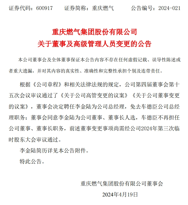 车德臣被免去重庆燃气集团党委书记、总经理职务,并提请股东大会免去其董事长职务。重庆燃气集团董事会决定聘任李金陆为公司总经理,同意李金陆为公司董事、董事长人选。