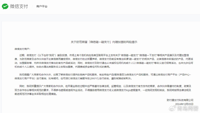 12月3日,微信支付官网发布关于防范假冒“微信碰一碰支付”代理加盟的风险提示称,近期,微信支付接到反馈,市场上有个别机构在各类互联网平台上发布关于“微信碰一碰支付”“微信碰一下支付”等相关产品演示及代理加盟信息,为防范商家及合作伙伴由于此类信息而遭受损失,微信支付在此郑重声明,微信支付目前没有推出所谓“碰一碰支付”的相关产品,此类信息中所描述的产品、代理活动、加盟服务等,均并非微信支付推出的官方产品或活动;同时,微信支付及财付通也从未授权任何机构或个人以“微信碰一碰支付”等名义进行招商活动,也未允许任何机构或个人以提供、协助办理此类服务名义收取加盟费、代理费或押金等任何形式的费用。
