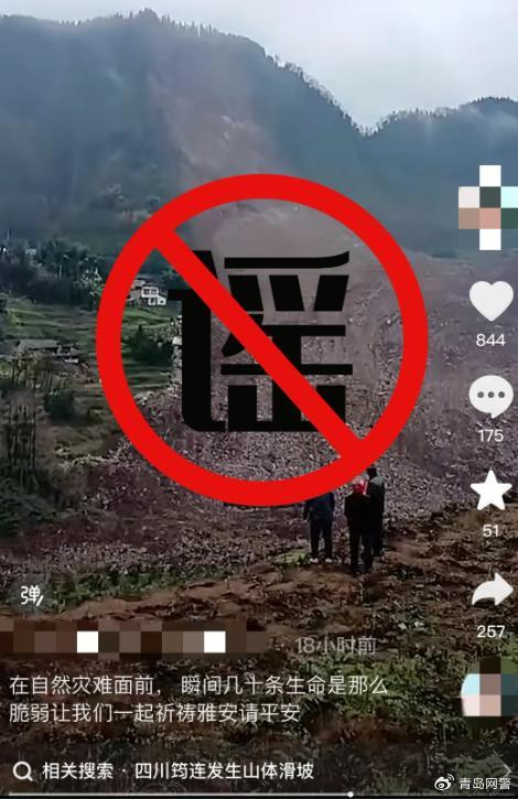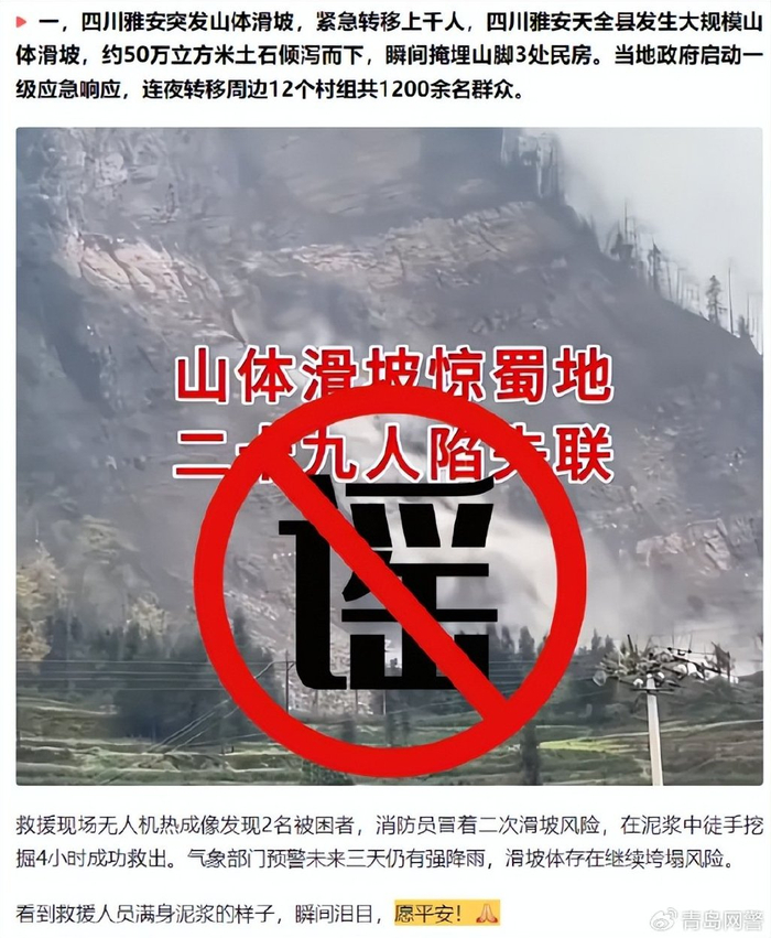 一则为某网民在今日头条发文称“四川雅安突发山体滑坡,紧急转移上千人,四川雅安天全县发生大规模山体滑坡。”