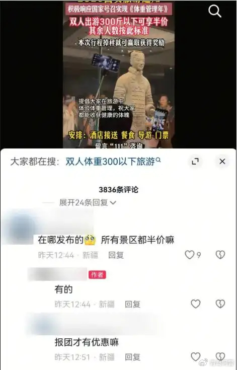 近期,不少社交平台视频账号宣称,为响应“体重管理年”号召,当地发布淡季旅游通知,将体重与景区门票优惠挂钩,如双人出行体重不超过300斤,就能参与景区门票减半活动。